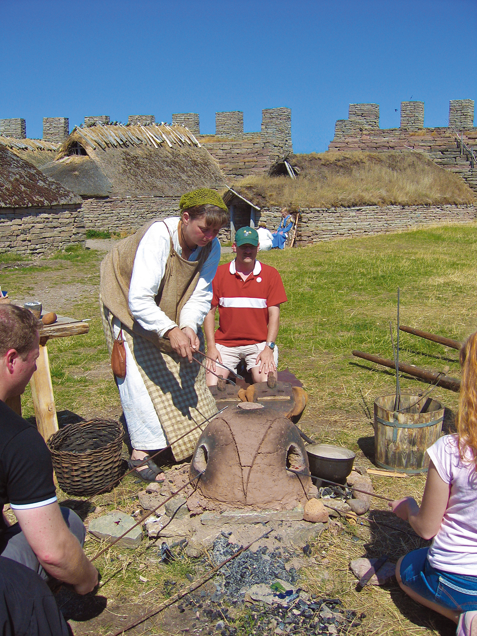 During the season, several archaeologists are employed, working with educational activities within archaeology. One part of this work is to demonstrate and help the visitors participate in every day activities and crafts. These activities are, as far as possible, based on our knowledge of how they were carried out during the periods in question. To watch and participate in the characteristic activities is a way of understanding the conditions under which the people of those times lived (See Fig 2). For a typical family, a day at Eketorp fort may look like this: on entering the fort, the visitor is greeted and offered clothes true to the period which they can wear during their visit, which is highly appreciated. Next, the visitor can try some of the crafts and activities that are the topic of the day, such as textile work or smithing. At certain times during the day, guided tours are performed, some of which start with a short role-play. After such a tour, the visitors can learn archery, visit the museum or pet the animals that graze freely in and around the fort.