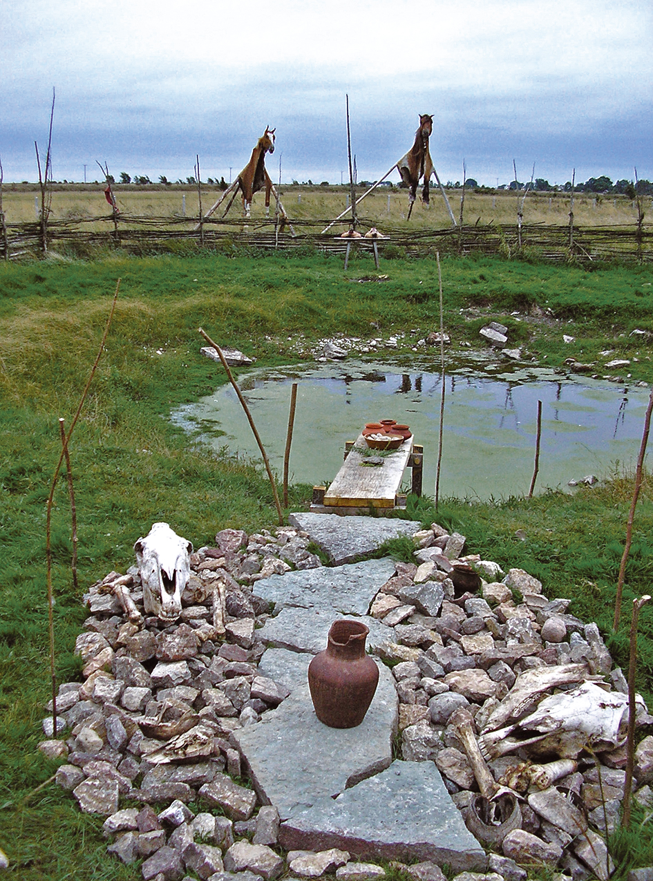 Ever since Kalmar County Museum took on the responsibility of Eketorp fort, there has been an internal discussion concerning the reconstruction of a sacrificial site and what it might have looked like during the Iron Age. Crucial was the question of how a horse offering could be illustrated. Among the arguments against the idea were those that suggested that visitors would never accept the use of real horse heads. The fear was that too many visitors would take offence and that it would be too disgusting for children. We discussed the possibility of using stuffed horse heads, heads made of wood, and/or other materials. Because of this ongoing debate, no reconstruction of the sacrificial site was made during 2002 and 2003. However, during 2004 and 2005, we settled the matter and decided to proceed with our reconstruction of the sacrificial site at Eketorp based on archaeological material, early medieval texts and anthropological studies. Here we will describe the reconstruction made in 2005, since it was the most complete one.