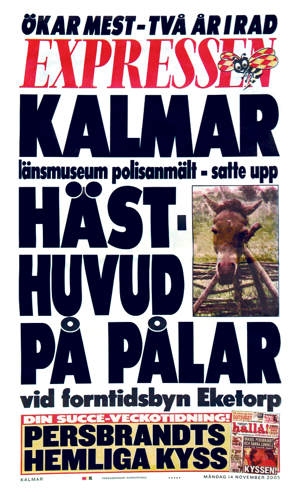 At that point we thought that the news value of the story was over. But two of the largest Swedish evening papers, Kvällsposten and Expressen, published articles on November 14th with the headline, “Severed horse heads were shown to children” (Expressen 2005: 24 and Kvällsposten 2005: 17). This headline constituted the Expressen´s news bill in the area around Kalmar (See Fig 6). These articles were biased towards the sensational and the morbid rather than the suspected felony. In both articles, a small “Short Facts box” was included entitled “The crazy rituals of the Vikings,” despite the fact that our reconstruction concerned something that took place several hundred years earlier.