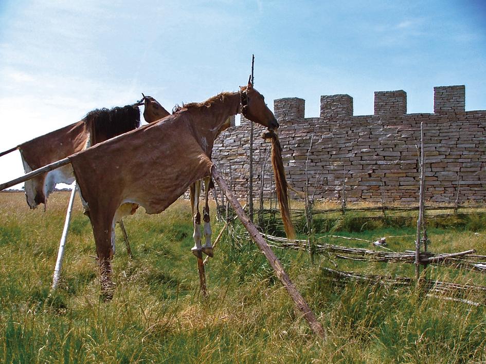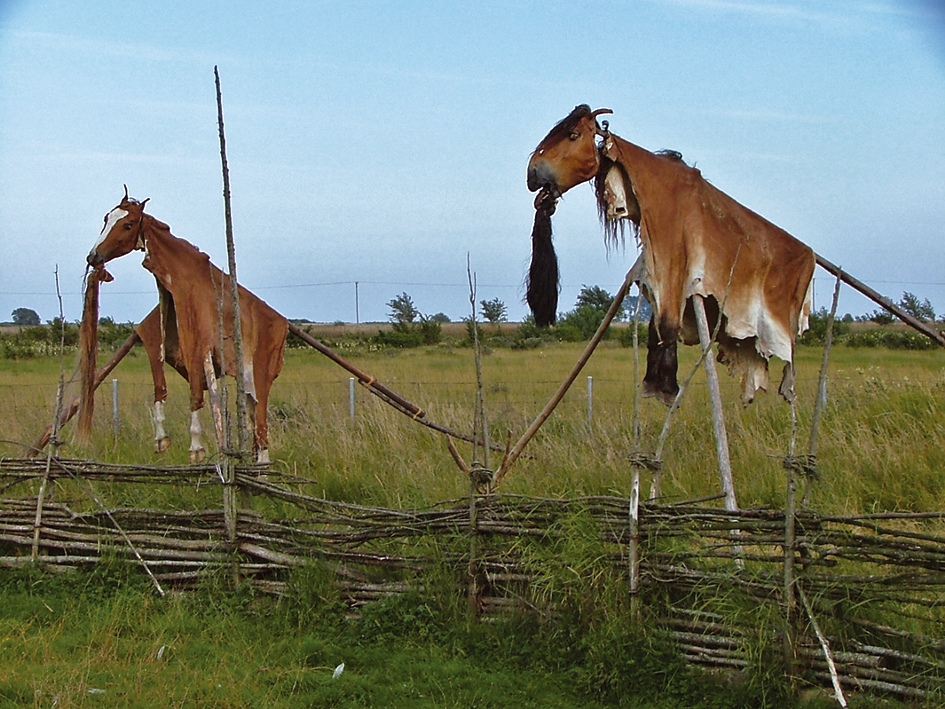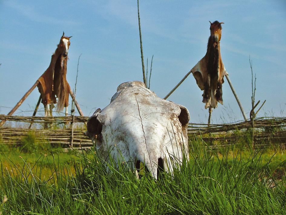 Anthropological studies of the Altai people from the 1840s are also often used to support presumed interaction and influence between the mounted nomad peoples and Southern Scandinavia. Altai horse sacrifice involved breaking the animal’s spine and skinning it so that the head, hoofs and hide formed a single entity. The hide was then placed on an approximately 8.5 m-long pole, with the horse head supported on its end and the legs hanging down on each side (Radloff 1884b: 20 pp).