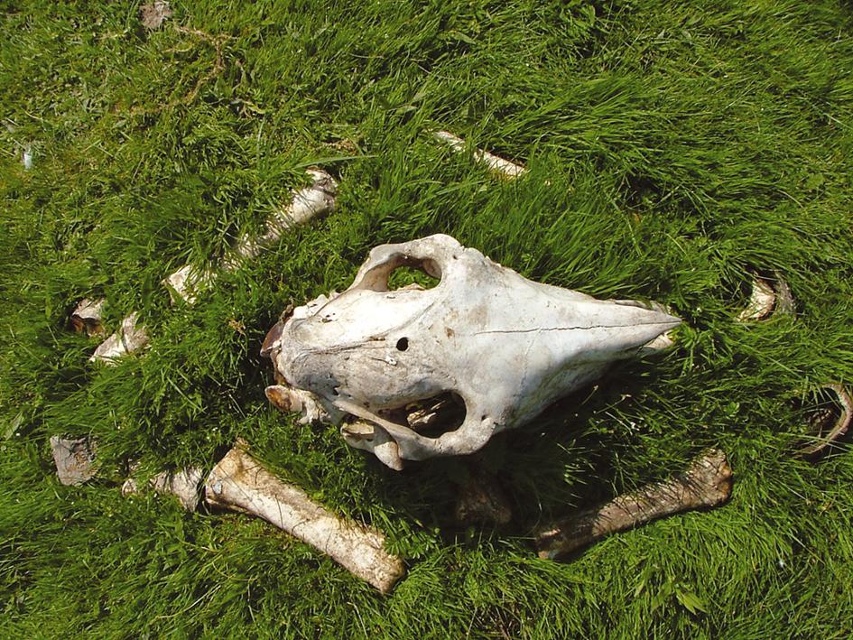Beside horses, bones from cattle, pig and goat/sheep were found at the excavations. Our reconstructions in 2004 and 2005 used pig bones to illustrate this point. In 2004, a fresh pig head was put on a pole with its feet lying beneath it. In 2005, two fresh pig heads were put on a table and the skeletal crania of the pig from 2004 was placed with the horse bones discussed earlier.