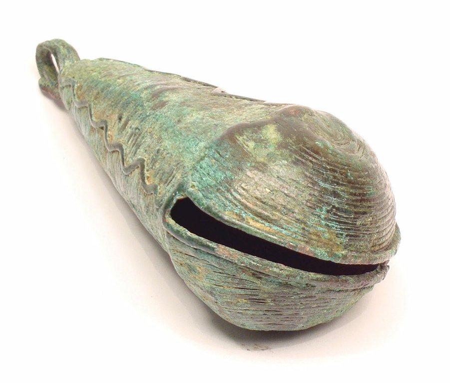 The spiral form of the suspension ring and the cord that descends from the base of that ring to the opening of the design are visible. This cord functioned as both a decorative element and a secondary smelting channel.