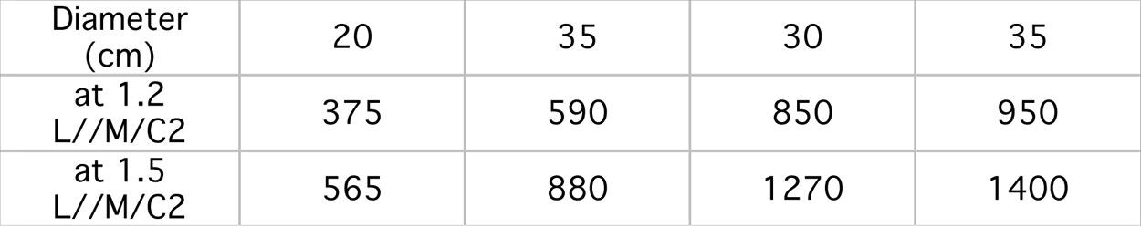 Table 1. Table of ideal air volumes by smelter diameters. Volume in Litres per Minute.