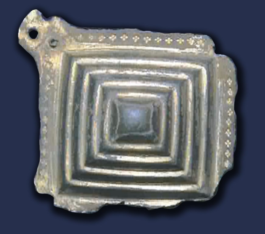 The reconstruction is based on a gilt bronze horse harness mount from Borg in Lofoten, found during a large research excavation in the 1980s (See Figure 1). The mount was found within the stable of ‘the Chieftains hall’ (longhouse I: 1a), a three-aisled longhouse with a length of 83 m, dated to the Merovingian and Viking periods (Munch et al. 2003). The mount measures 5.2 x 4.8 cm and is shaped like a step pyramid. In the middle, there is a small silver button, while the brink is covered by rhombic-shaped stamp decorations. The harness mount is of Ørsnes’ type 9D3, variant b, which dates to the Early Merovingian period, i.e. the second half of the seventh century AD (Ørsnes 1993: 240). Harness mounts of this type are rare and can be considered luxury items. They are mostly known from Germany, but are also found in the Trøndelag region of Central Norway, in Bornholm, Denmark, and in Gotland, Sweden (Munch 2003: 242-243). Two replicas of this mount were cast by Ravn Forhistorisk Støbeteknik from Denmark, and made up the basis for the reconstruction.