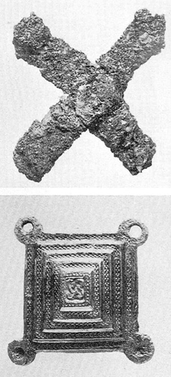Since the harness mount was the only preserved part of the Borg bridle, it was necessary to consider the evidence from other more complete finds. Most of the harness mounts of this type have been found without iron crosses of the Valsgärde type on the back. It was therefore considered to be more in agreement with the archaeological material to omit this particular feature in the reconstruction.