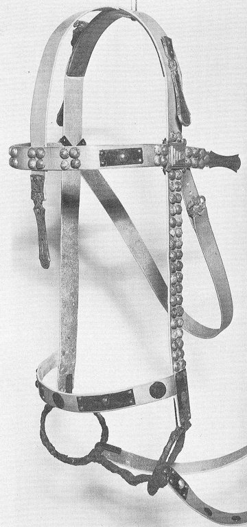 The reconstructed bridle could successfully be tested in all gaits. It appeared to be functional and solid and did not cause any harm or discomfort. The horse responded well to the bridle and the bit, which both had a relatively mild to medium severe action. Even though no strong rein pressure was required, the light but permanent strain is assumed to cause marks of wear on the harness mount in a long term. The reconstructed bridle did not fit perfectly to the horse on which it was tested. Anyhow, the design fitted better to the horse’s anatomy than on some previous reconstructions. However, it was clearly shown that bridles with this type of harness mount must have been custom fitted to each horse.