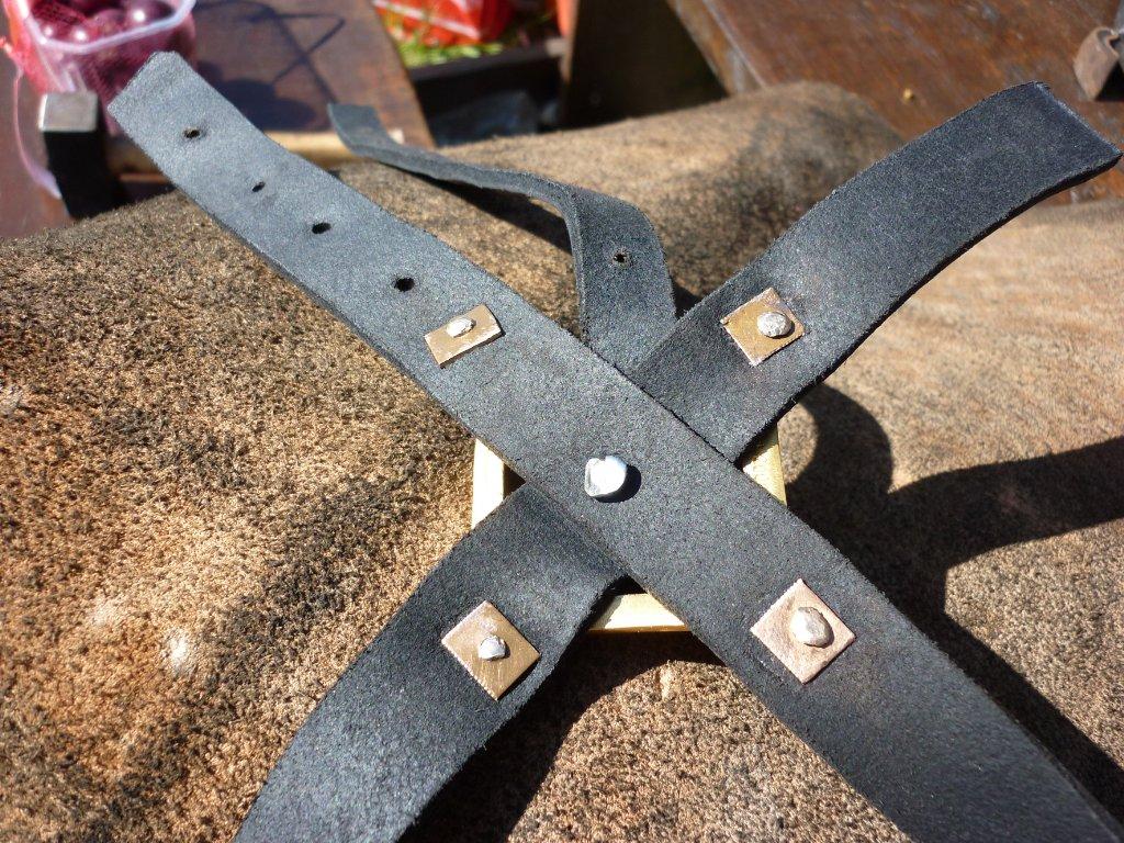On this reconstruction, the harness mount has both a practical and decorative effect, as it keeps together the essential parts of the bridle, and at the same covers the crossing of the straps and the iron rivet. This interpretation is supported by marks of wear on the original mount’s rivet holes, which are evidence of the forces that exerted on the mount. Once the rider applies rein pressure, the part of the bridle, which is held together by the harness mount, will be strained. The so-called hand or rein aids apply pressure not only onto the bit, but via the bridle, also on the horse’s poll (Edwards 2004: 50-55). When a noseband is used, the rein aids may also act on the horse’s nose. But because of the bit type used for the reconstruction, the bridle was designed without a noseband.