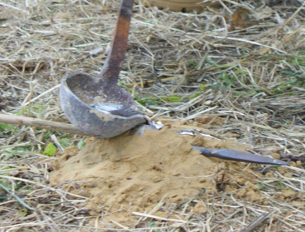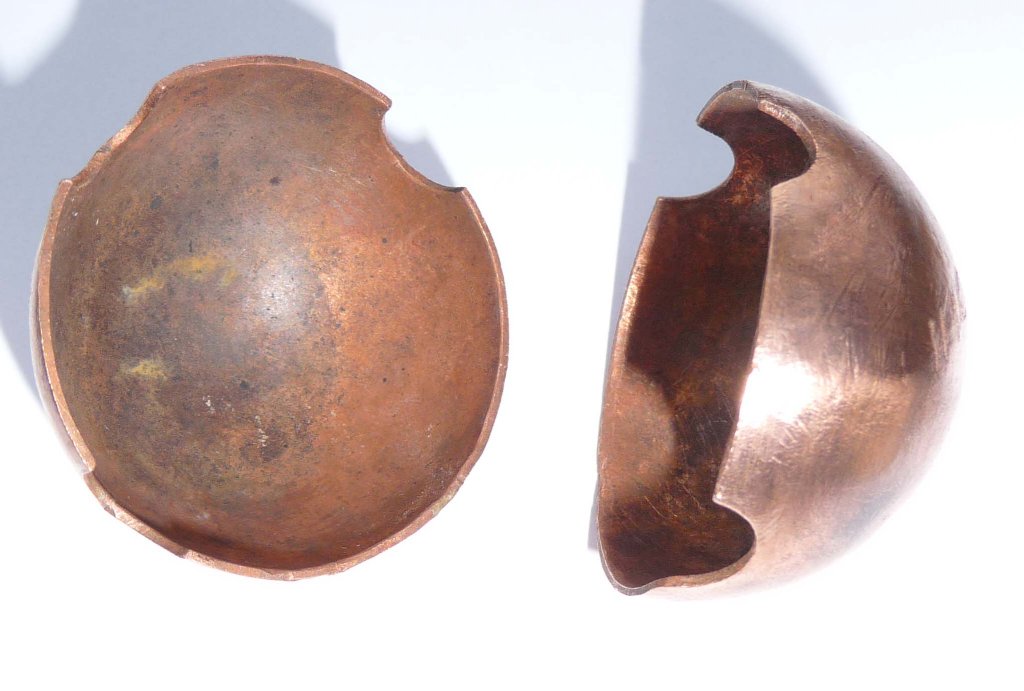 The disc was annealed. A dome headed wooden mallet was used to hammer the disc into a concave hemisphere in a wooden block. This produced a hemisphere with rough edges. The hemispheres was placed on a flat piece of sand stone and rubbed with a circular motion until the edges were smooth. This was then repeated to produce a second hemisphere and these edges were also smoothed until the edges of both hemispheres fitted with no gap. The two pieces placed together did not form a true sphere but a flattened sphere. Such a weight would be much easier to carry inside a shield and so it was decided to keep this mould and use it for tests.