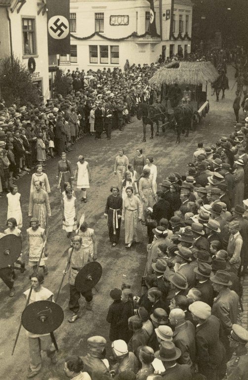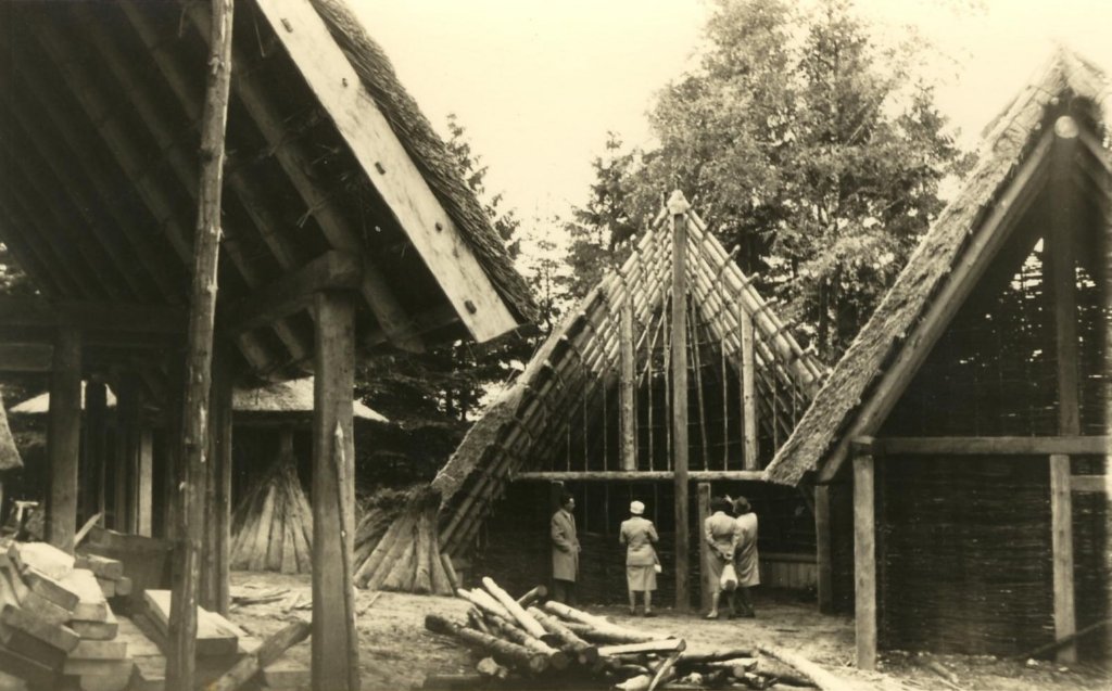 In 1936, the Reichsbund für deutsche Vorgeschichte (Imperial Union for German Prehistory) constructed two complete decorated Germanic houses. For the opening ceremonies of this new kind of museum, a large number of National Socialistic (NS) VIPs visited, including among others Reichserziehungsminister (Imperial Minister of Education) Alfred Rust and, a little later, Reichsleiter (Imperial Leader) Alfred Rosenberg (See Figure 3). This exemplifies the high importance this site received in this period. The only comparable monument of the National Socialist historical propaganda in Germany is at Unteruhldingen at Lake Constance.