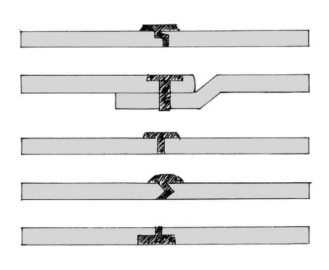During the process of casting, many problems can become apparent. Gas bubbles or irregularities in the mould can damage the surface of the bronze object. This was often the case, which meant that most of the time the surface had to be repaired. For this purpose, bronze patches were used. These patches could be made to fit the damaged areas exactly. Figures 1 and 2 show some of these patches, and the methods that may have been used to fit them into the irregularities on the surface of the bronze (Bol 1985). The damaged areas were shaped first, then the patches were hammered into the openings. When joining different parts of a bronze object, we distinguish between mechanical and metallurgical attachments. Mechanical attachments consist of interlocking parts. This is achieved by hammering, twisting or bending the separate parts in the area of the joint. Very often a metal dowel or a rivet was added to the joint to provide extra support (Haynes 1992).