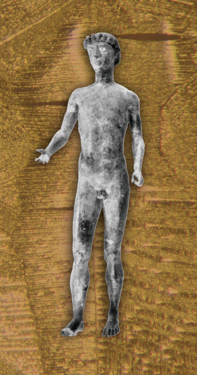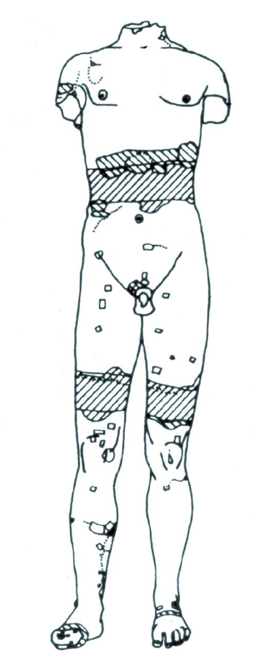 Figure 4 is an example of a bronze statue that was repaired in antiquity. The statue was found in 1882 in Sicily, in a ceramic coffin, and is dated in the sixth century BC. The ancient repairs on the statue were described by Anna Maria Carruba (Carruba 1983). In modern times the statue was restored first in 1928, and then again in the 1980’s, when it was taken apart completely. An X-ray of the statue showed a lot of patches on the surface of the bronze, particularly just above the knees and around the waist (See Figure 5).