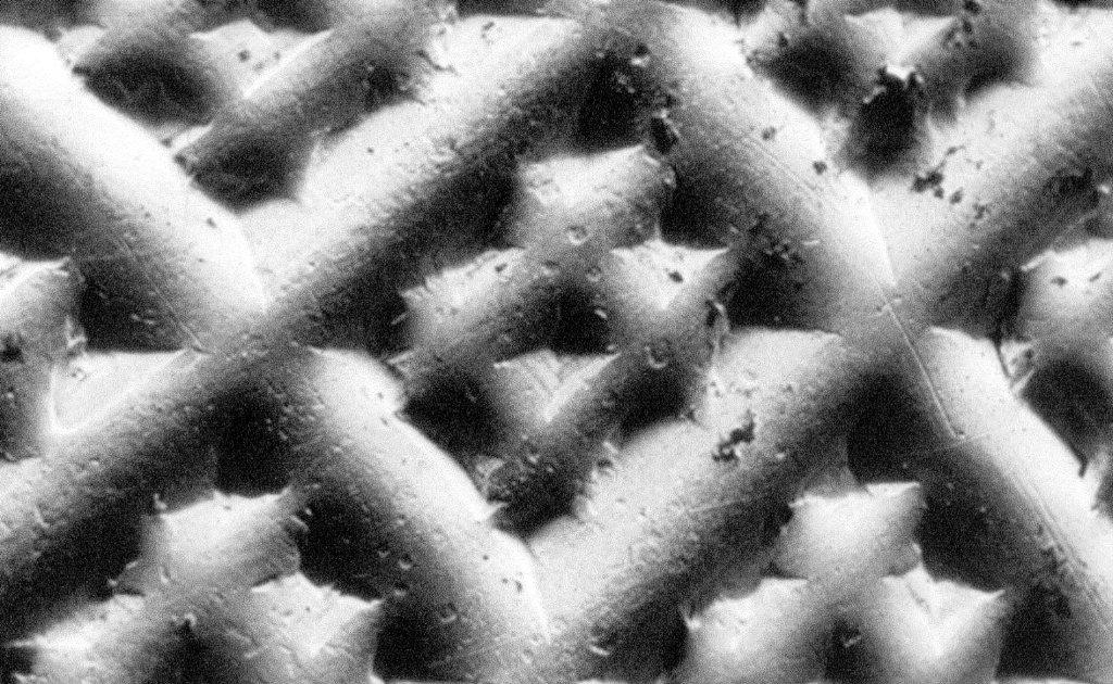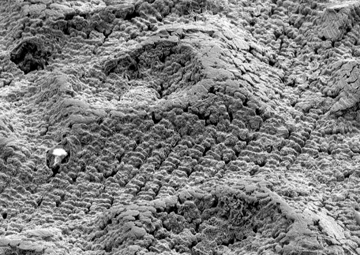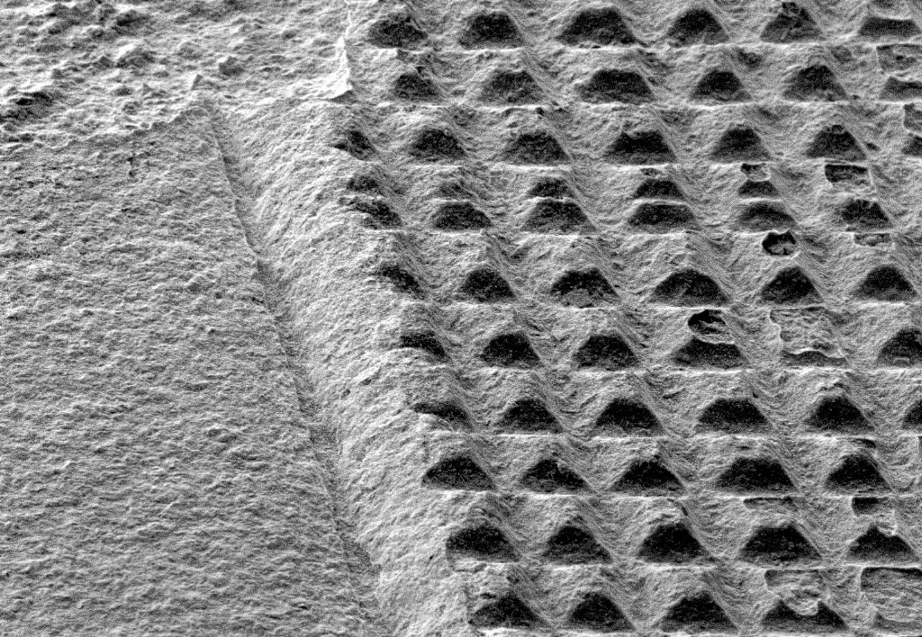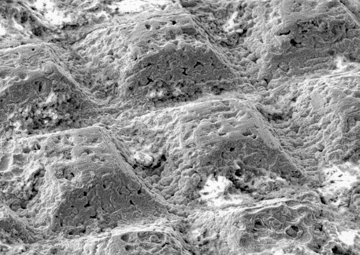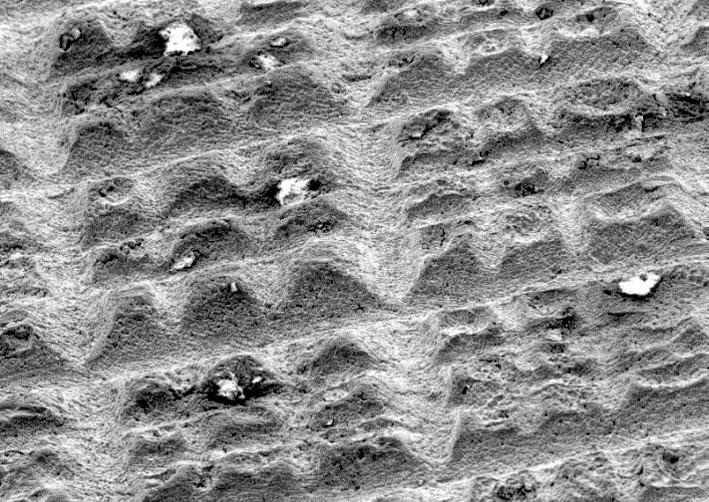 During casting, one of the moulds was found not to have had the wax fully removed; as the molten metal was poured in the residues of wax burnt off instantly and the metal was blown out. In this case, the cast metal formed a plug in the ingate, but this proved valuable because we were able to open the mould and examine it to look at the detail of the inner mould wall (See Figure 9). This mould was examined directly in the SEM and showed that it had taken all the details of the wax model extremely well, the pyramids (of the original die) being well formed (See Figure 10). Even a miscut line on the original die at 0.1mm spacing was clearly reproduced in this mould. Similarly, the imprint of the ‘boxed’ pattern shows all of the basic geometric pattern (See Figure 11). However, a limiting factor for the resolution of the mould surface appears to be the actual texture of the fine clay slip. The clay particle size of the slip was a few microns, and is thought to be about as fine as one can achieve in practice. The clay particle texture on the pattern in the stamped regions of the mould was the same as the texture on the un-stamped original wax surface (See Figure 10 and 11). The patterns were well formed so this was a successful result as far as modeling and mould making was concerned, and showed that the investment procedure was satisfactory. Although the investment clay particles were very fine compared to the size of the pattern, they added a small but significant texture to the mould surface. It would be interesting to see whether this clay texture would be observable on the castings.