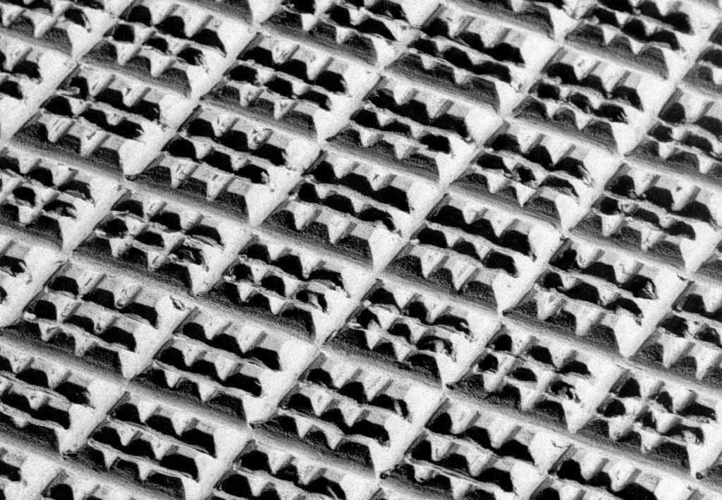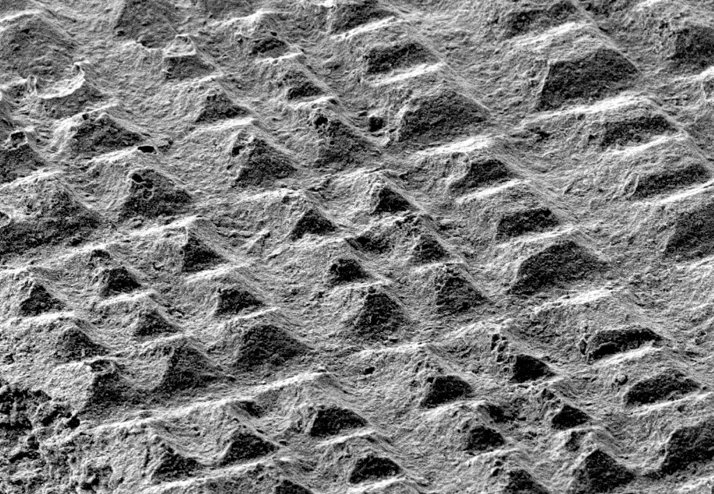 With negative cast dies like these experimental ones, it would be possible to use extremely fine files to clean up the dendritic surface somewhat, but whether the cast pattern could be significantly improved depends how far into the metal the porosity extends. Excessive filing would significantly alter the line widths and depths, and give the pyramids sharper points, and might possibly spoil the die.