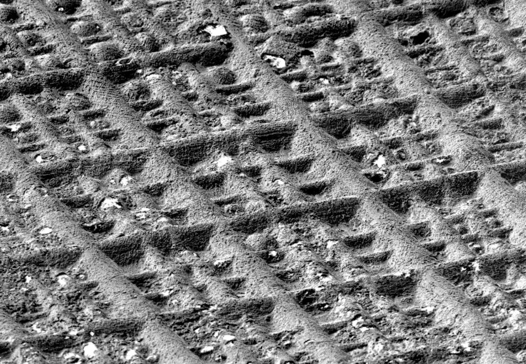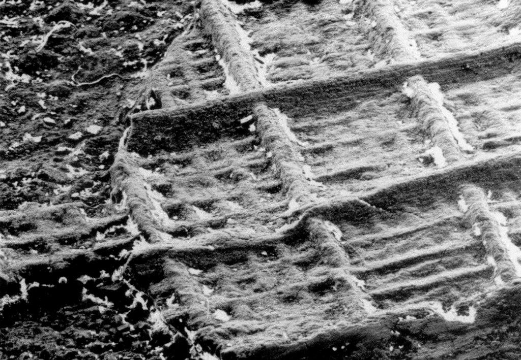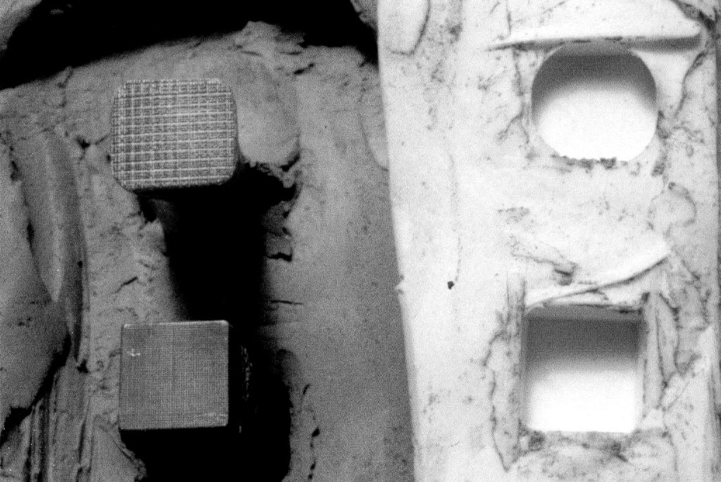 On these cast dies, there still was some clay stuck in the depth of the fine lines. The surfaces were brushed with a soft toothbrush in order not to polish them too hard. Despite this, a slight abrasion of the patterns may have been unintentionally made, because of the released clay and sand from the moulding material itself.