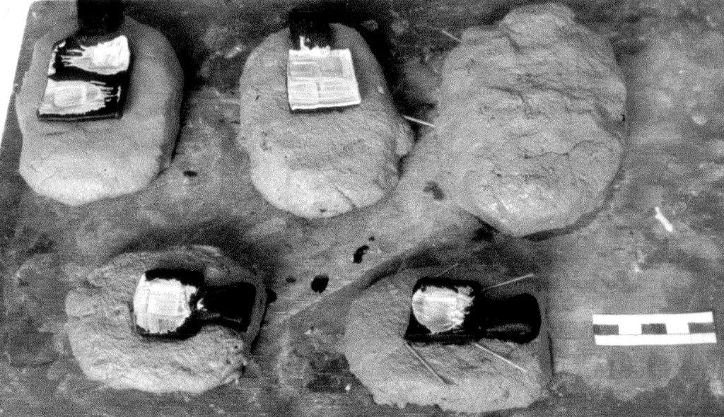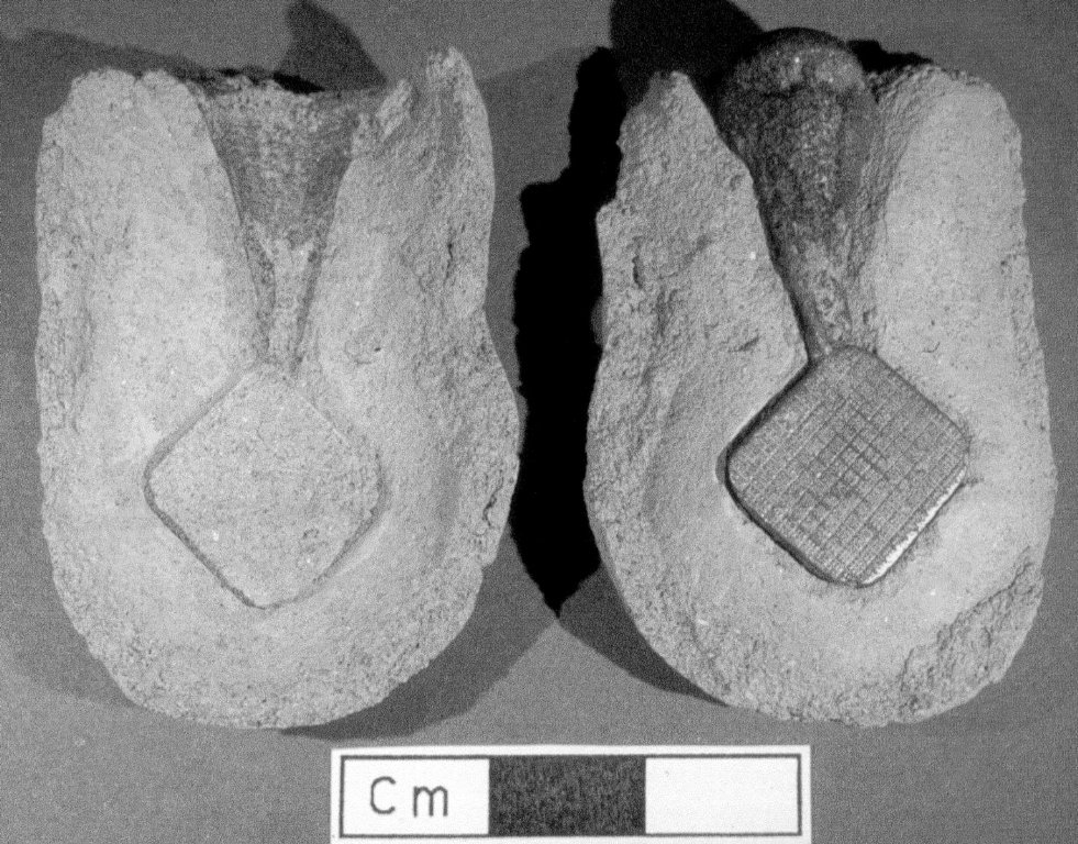 Making the moulds from these wax models was a routine procedure. The local Wilhelminaoord loam-clay was used, being very clean but with an organic content. The backs of the 'potato' sized moulds were made about 2cms thick and placed on a flat surface. Wedge-shaped wax ingates were made and moulded onto the wax die models. The models were then put onto the clay mould backs, with the die impressions facing upwards. Thin straw tubes were placed touching the wax models and angled towards what would be the top of the mould to act as risers, two on each side (See Figure 8). The important next step was the investment of the wax die faces with very fine clay, which would become the mould walls with all the details of the wax pattern when the wax was melted out.