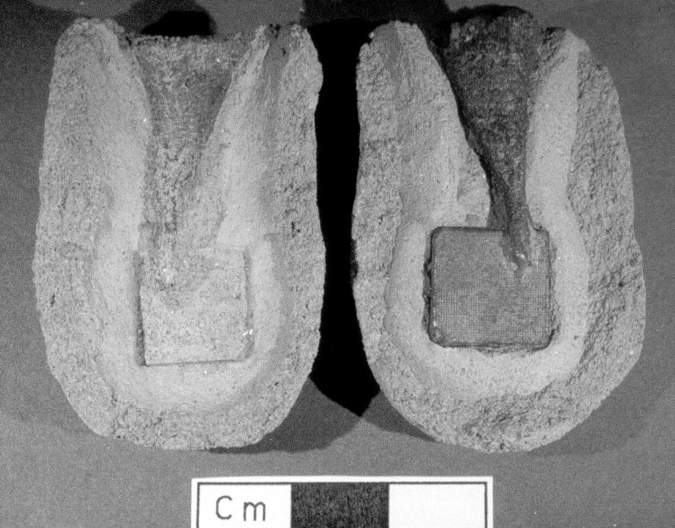 The second set of die casting experiments was carried out by Anders Söderberg under more controlled workshop conditions, in Sweden, to try to achieve improved highly detailed castings than were obtained in the field, and to record conditions under which these were obtained. His expertise is in fine castings. In this case, silicone rubber moulds were made of both the Sutton Hoo model dies (See Figure 13) and wax impressions were taken from these for investment and casting. Thus the final cast models would be three generations away from the original cut model Sutton Hoo dies, but under the microscope the silicone copies showed no apparent loss of detail in this process.