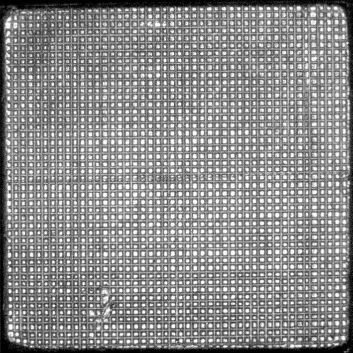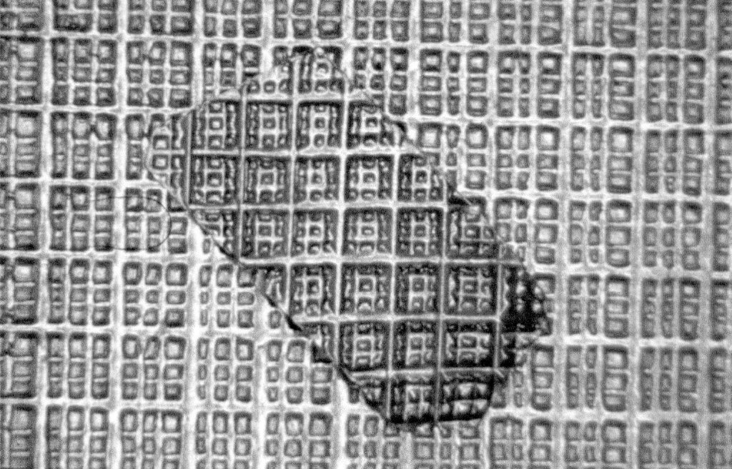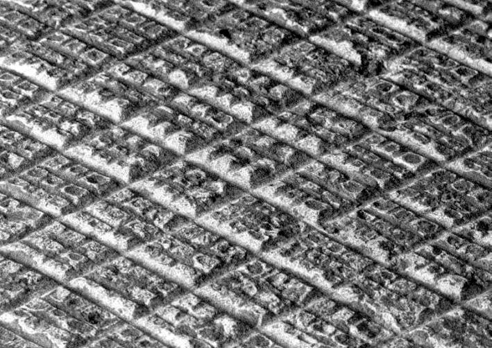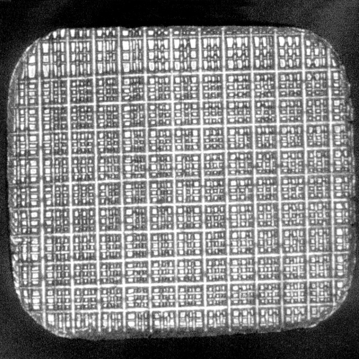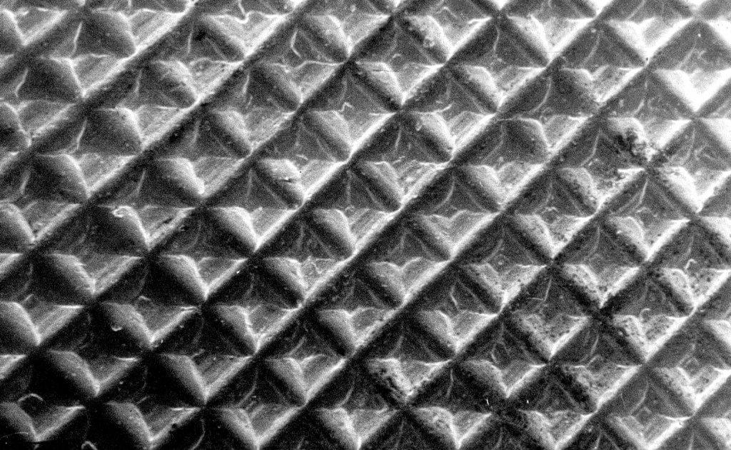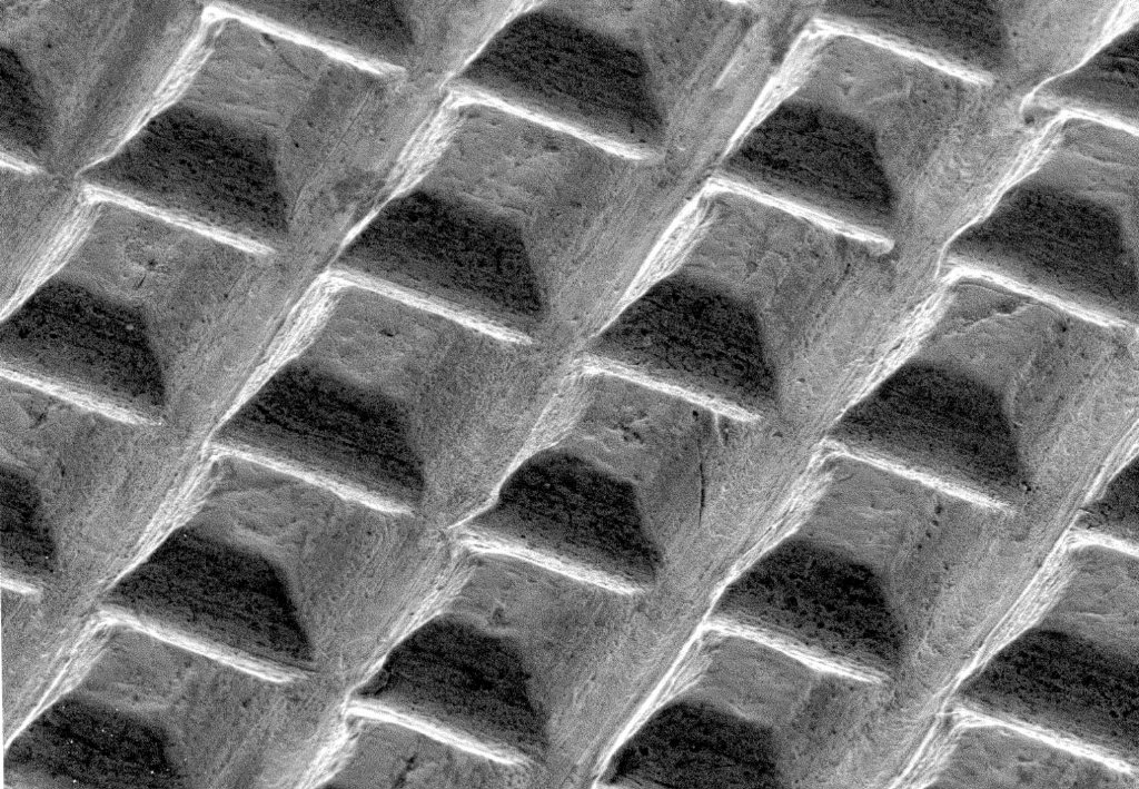 The general comments applied to the 'boxed' casting also apply to this 'standard' pattern casting. In fact this casting is perhaps more impressive as the line separation is only 0.2mm and the full area of the original die has been successfully cast with all of the pattern of lines showing. The fine clay mould face must have accurately reproduced the original cross-hatched die pattern and had resisted erosion from the molten metal despite the tiny size of the pyramids whose tops are only about 0.12mm square, but there are some defects in the casting where pyramids have not fully formed (See Figure 19). At high magnification (See Figure 20, x180) the accuracy and angularity of the cast grooves and pyramids are seen, but, as with the 'boxed' casting, the dendritic surface is also clearly visible, and there is no evidence of any clay particle texture from the mould.