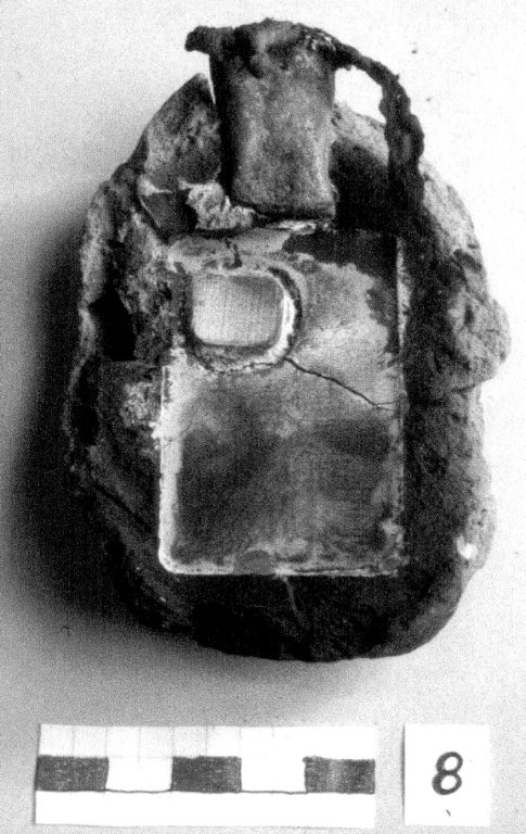 In half of the models, a thin slurry of the finest clay was made and painted onto the wax die faces to ensure that all the air was excluded and the clay reached every part of the fine pattern (See Figure 8). Fine clay was then moulded directly onto this clay slip, after sufficient manipulation the ensure a very soft texture. With the other wax models the same fine clay was applied directly to the wax. The local loam-clay was again used to make the 2cm thick front of the moulds. The mould halves were carefully sealed together with clay to form a one piece mould. The moulds were allowed to dry slowly at first, at room temperature, then at radiator temperature overnight as they were needed for casting the next day. Slow drying was essential to avoid shrinkage cracks from forming.