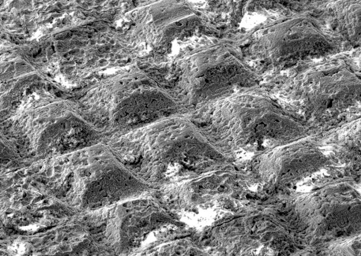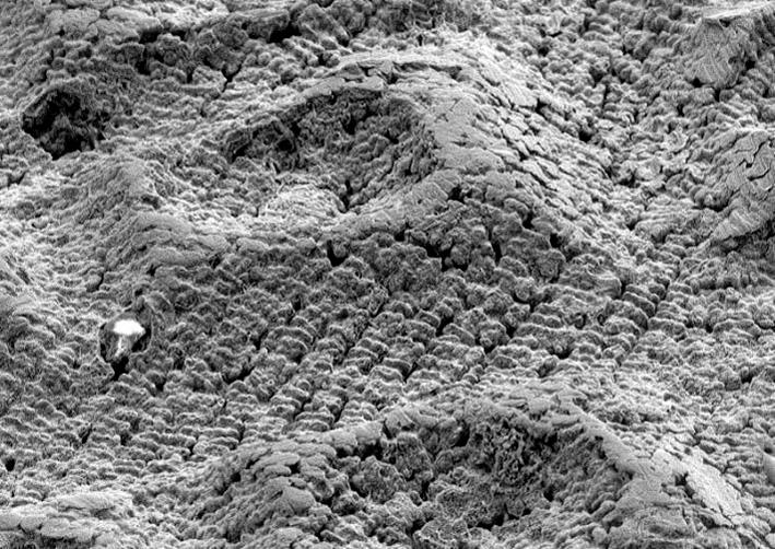 If these experimental dies were used in their as-cast state to stamp gold foils, then the foils would reproduce the dendritic surface texture, because gold is very soft and the force of punching is so great. This texture would be clearly seen under high magnification. None have been seen on the Sutton Hoo gold foils indicating that those dies were cut, not cast. To simmulate the effect of a punched, dendritic foil texture, Figure 21 shows an image of the 'boxed' die in which the SEM image is rotated through 180°C to give an optical illusion of what a positive foil surface would look like using the cast die as a punch. This can be compared to the image of the Tjitsma die (See Figure 1), but it should be noted that the original Tjitsma die has a corroded surface and any evidence of surface dendrites that may have been present are lost. However, the comparison does emphasise the design similarities of the 'boxed' patterns between Tjitsma die and the Sutton Hoo model die, and hence the original Sutton Hoo gold foils..
