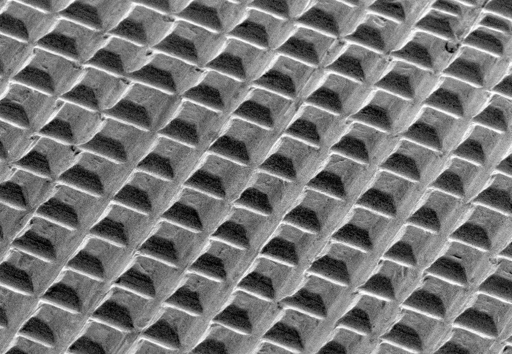 At low magnification (See Figure 16, x20) the casting seems to have taken the whole boxed pattern well. Both the wider and finer spaced grooves are well formed in both their cross-section shape and in the angularity of the pyramids. The casting is a good representation of the original cut die. Only the depressions on the points of the pyramids from trapped air during moulding (noted above) spoil the casting. There seems to have been no problem in casting the main features of the pattern with these fine dimensions. Even the slightly irregular shapes of the original cut die pyramids are seen. However at higher magnification (See Figure 17, x50), the dendritic surface of the casting is clearly visible, although where the lines intersect, the corners of the pyramids are still quite angular. The texture of the dendrites is much more coarse than that of the clay particles of the mould, and in some areas is particularly more coarse (See Figure 18, x200). The dendritic texture is clearly the limiting factor for the resolution of the casting, the dendrites being much larger than the clay particle size of the mould. By comparison, the original cut die is much sharper (See Figure 6).