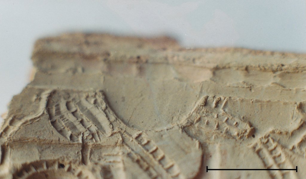 The round upper parts are easily recognized (See Figure 6; left & middle) and the lower parts of the moulds as well, but the evidence for the side parts having been divided into four separate pieces seem fairly weak an undistinct. The side parts seem to have been broken in random patterns and the cracks are uneven, as if they have broken randomly. The side-fragment shown at the right in Figure 6 is broken straight across an ornamental field, and not as would be expected by the ridge between the fields.