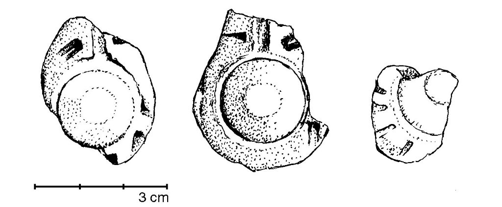At the workshops at Helgö near Stockholm, 526 fragments of moulds for copper alloy clasp buttons were found, dating to the Migration Period. They were analysed by Kristina Lamm in the excavation report (Lamm 1972).