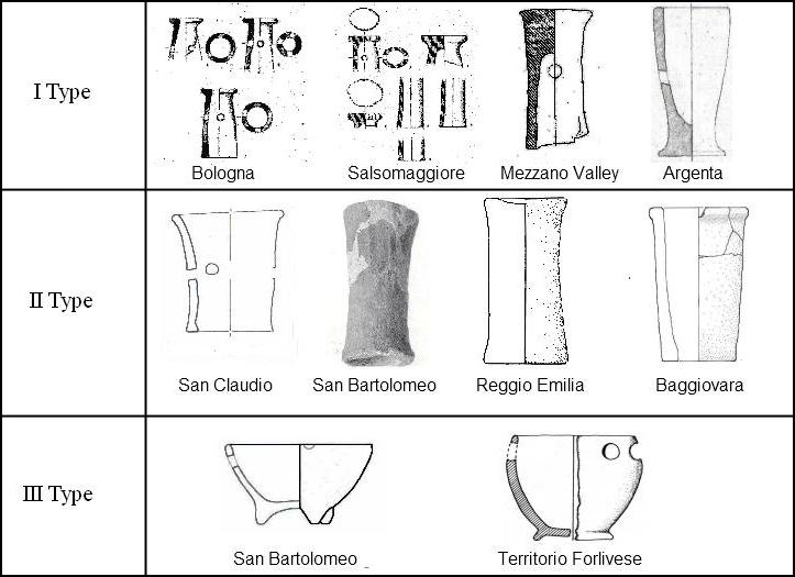 The first type, including technical elements found in the San Vitale necropolis in Bologna (Taglioni 1997, 207-224), in Argenta (BermondMontanari 1993,248-252), in Mezzano Valley (Taglioni 1997,216) and in Salsomaggiore (Taglioni 1997, 215-216), has a cylindrical body with breathing holes and a plain disc on one side and it is datable from tenth to eighth century BC. The second type, formed by technical elements found in Verucchio (Gentili 1987, 257-258), in San Claudio (Malnati, Losi 1990, 87-125), Baggiovara-Martiniana route (Zamboni 2003-2004, 114), San Bartolomeo-Case Bigi (Patroncini1970, 88-89) and some elements which are part of the Municipal Museum of Reggio Emilia (Damiani, Maggiani, Pellegrini, Saltini, Serges 1992, 344), has an hollow cylindrical body without a proper plain disc, but with lips slightly expanded and breathing holes. This type is datable from the late ninth century until the sixth century BC and is comparable with the supports found in the Palaeoveneto kiln in Crosare di Bovolone (Salzani 2002, 178), used to cook big pots upside down. The third type, including technical elements found near ForlĂŹ (Von ElesMasi1982, 262-263), in San Bartolomeo-Case Bigi (Damiani, et al. 1990, 141-145) and in Baggiovara-Martiniana route (Zamboni 2003-2004, 114), has a vase shaped body with breathing holes and it is datable from the sixth century to the first half of the fifth century BC. There are several interpretations made by scholars about this technical elementâs function and, although I believe that only an experimental approach could prove their aim, it seems that elements included in the first and the second group were used to cook big pots upside down. Then it is possible that supportsâ aim varied according to the their use, inside the firing chamber with slotted platform could be used to support big vases; when pots were in direct contact with fuel, supports were used to keep artefacts separated from coals.