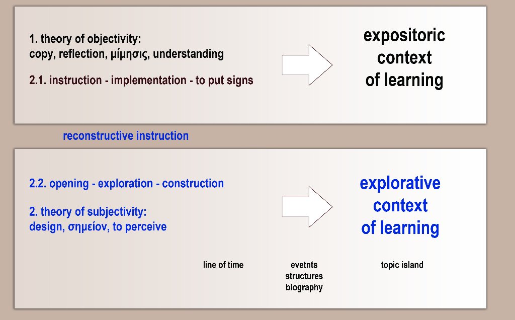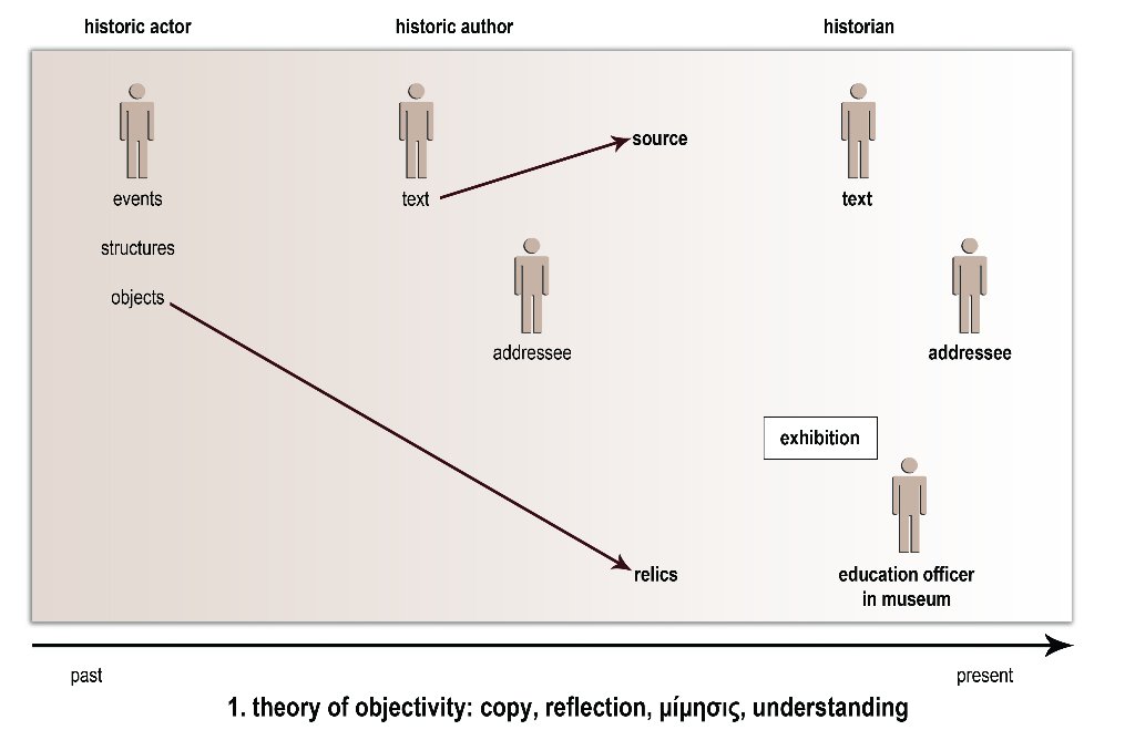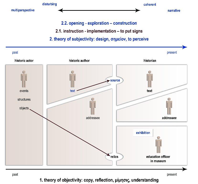 If we share the constructivist model, objectivism leads to unacknowledged fiction. Empathy has no place in historic consciousness (van Norden 2011b, 122f.). Emotions may mislead: if your feelings towards a site or object seem valid, you might be convinced that what has caused that emotion is also authentic. In constructivism reconstruction means to uncover our way of integrating the material relic into new contexts so as to fill the gap which arises from decontexualisation by time passing with our new connotations.