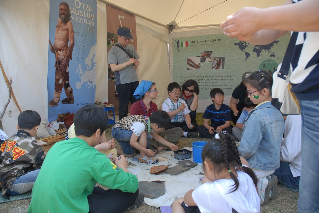 In order to ensure that serious archaeology got its share, the large party was complemented with the Heritage Education Expo. In this framework I was allowed to participate in the festival on behalf of the Tirol Archaeology Museum. Here, specialists from all over the world showed the public how they work with public in their own museums: on off er were, among others, stone knapping, metal casting, stone working a la Ötzi (See Figure 7), determination of bones, making fire, playing with excavation, or to put it short: the whole bandwidth of actions one knows from one’s own museum, but also a lot of new things, exciting and stimulating the further development of one’s own activities. The enormous interest and friendliness of the numerous visitors, and an excursion to archaeological sites and to the border with the neighbours in the north, which reminded me in a painful way of our own German past, these many interactions with a different culture have made this trip to a real experience.