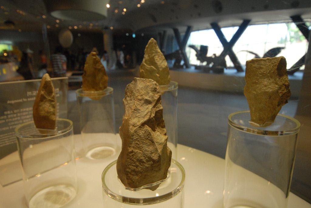 In 1978 the American soldier Greg Bowen discovered several hand axes near Jeongok in the Yeoncheon Province. They belong to Homo erectus and date to the Acheulean and are about 450,000 years old (See Figure 2). At the time they were found, these finds were the oldest tools of the East Asian Lower Palaeolithic. A surface of 800,000 square metres of the archaeological site was protected and repeatedly investigated by Korean and international archaeologists. In 17 excavation campaigns so far over 6,000 stone artefacts have been found, most of which are made of a coarse bright quartzite, which can be found in the Hantan river and its fluvial terraces, and which were easily accessible to Stone Age people. With just a few targeted blows of a hammer stone, this material was shaped into simple but efficient tools like hand axes, choppers, cleavers and picks.
