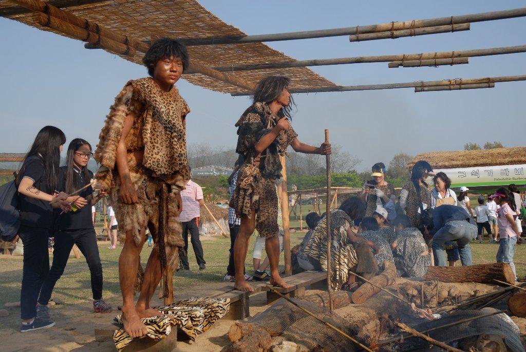 The Jeongok-Ri Palaeolithic Festival has also developed from its modest beginnings into a large event with regional or even national importance. In Spring 2012 the 20th anniversarywas celebrated. For over a week, the huge festival area attracted hundreds of thousands of visitors, with many activities they could actively play a part in or witness. The spectrum ranged from public shooting with a bow and arrows to pulling megaliths, costumed dancing, prehistoric slapstick (See Figure 5 and 6) and karaoke shows, to evening concerts with Korean music stars and huge fireworks. All of it was very loud, multi-coloured and seemed quite unconventional. An archaeological spectacle like this would – at least in Germany – be hard to imagine, as it would be seen as conflicting heavily with our ambition to be perceived as authentic. However, thanks to the eff ect that this form of display has on the public, it is possible that every South Korean child knows about the site Jeongok and that early humans inhabited the site for a long time.