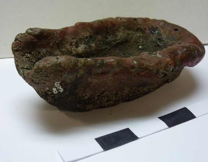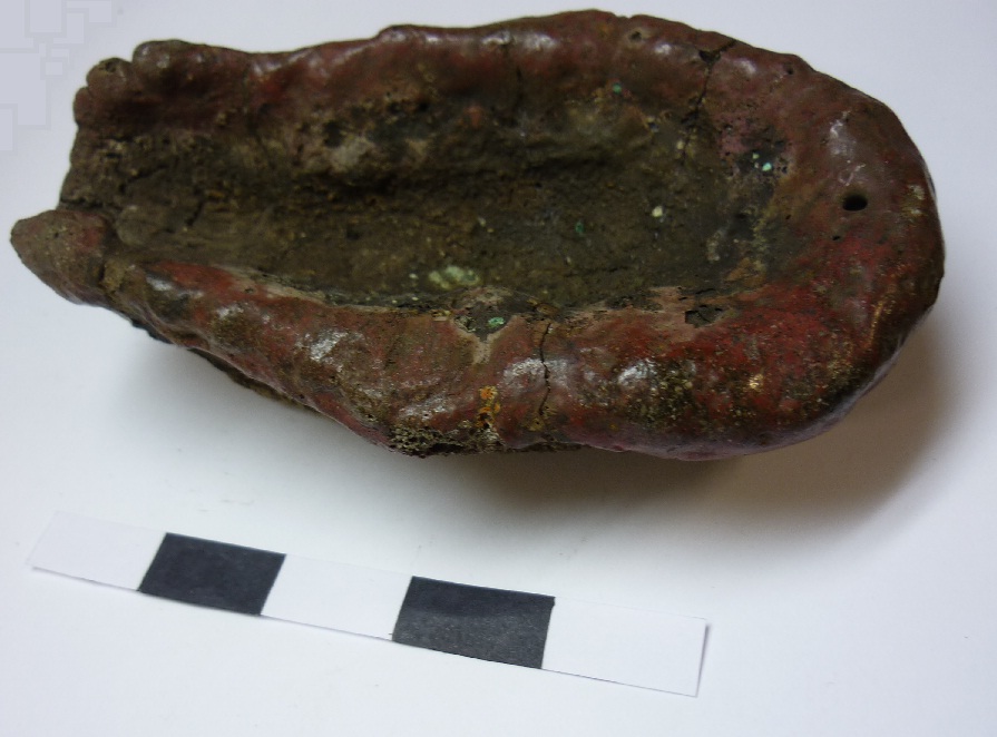 The crucibles found at Broåsen correspond well with the Bronze Age crucibles in southern Scandinavia in general. They are oval shaped, low and without a lid (See Figures 1 and 2). When studying the crucibles it is clear that they have, in most cases, been exposed to extensive heat from above. This indicates that they have been used in a workshop where the heat is intensified by an added oxygen flow coming from above. The reddish colour that is present inside and on top of the rim (See Figures 1 and 2) derives from copper-oxide coming from the copper-alloy in connection with the melting. The shape of the crucibles found at Broåsen does not vary much. However, the size does to some extent. The twenty refitted and whole crucibles were roughly divided into three approximate sizes: small (8 x 6cm), medium (10 x 6 cm) and large (13 x 8 cm).