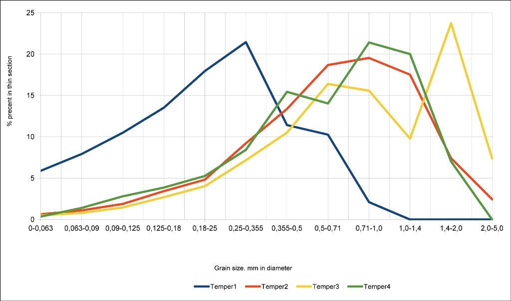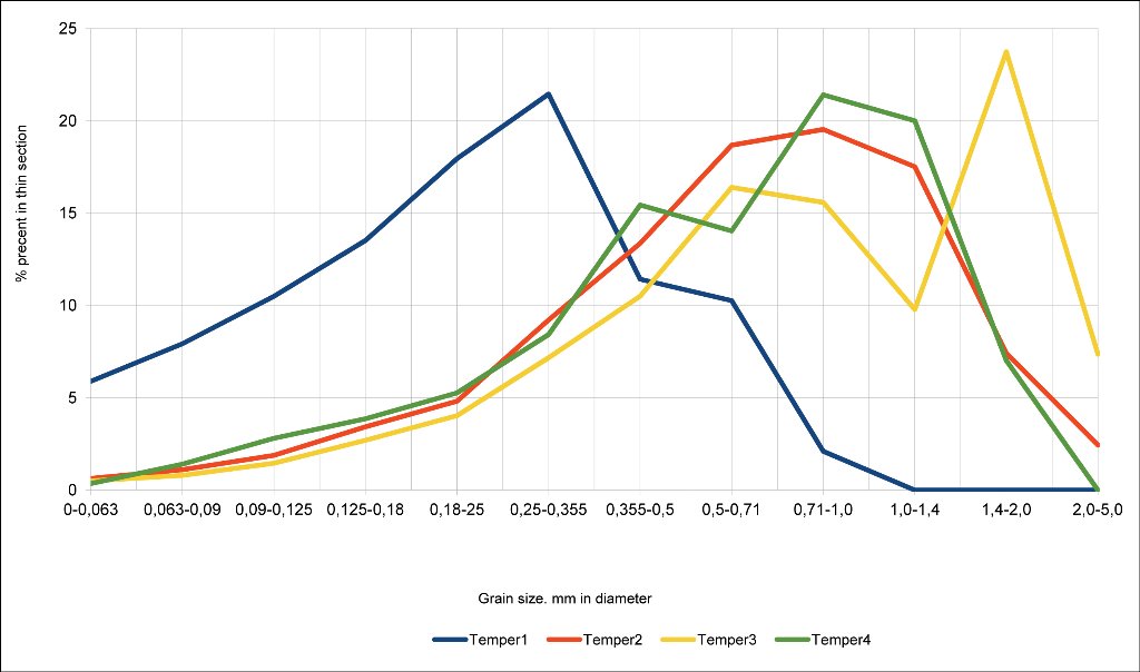 Graph 1. Grain size distribution in the original crucibles divided up in four different types of temper (See Table 1). Tempers 2 and 3 are an average representing all the eight sherds that were involved.