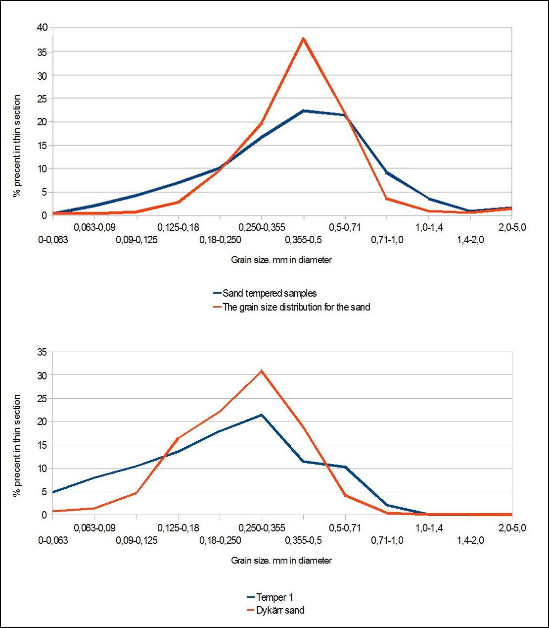 Table 2. The grain size distribution of the original temper was used to find a similar match for the replicas. In order to make an as accurate choice as possible eight ceramic samples were made of clay tempered with sand. The temper (sand) were first sieved to investigate the grain size distribution, the finished samples were then again investigated in thin section (using a picture analysis program mentioned above) to estimate the grain size distribution of the temper (sand) a second time but with another method. In this way the method of using thin section analysis to estimate temper was evaluated. Thus the left diagram shows how sand is viewed when conducting thin section analysis. As an example Temper 1 was replicated using quartz rich sand from Dykärr, Småland south Sweden (right).
