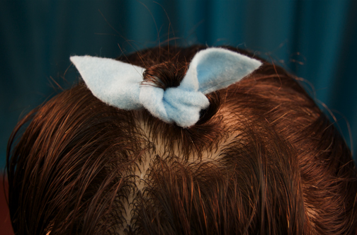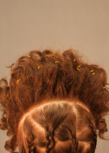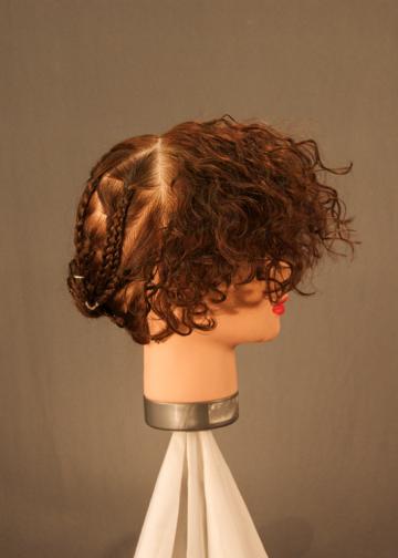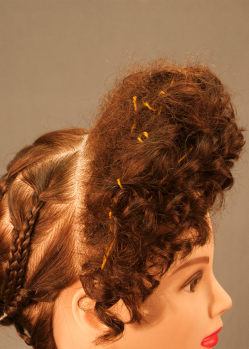 With a hair bodkin, divide the back hair from the front hair using an ear to ear parting over the top of the head. Secure the front hair out of the way with bodkins. Divide the back into small braids. Wind the back hair into a wreath bun and stitch in place.