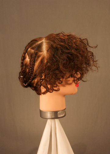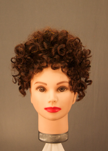 | Tier 2: | Release the hair of strip Section 2. Make a series of small spiral curls from midstrand to ends only. After creating each curl, grasp it firmly at midstrand and back comb until the strand stands erect from the head. For this action I prefer fine tooth wooden combs. Check that all curls stand similarly tall. |