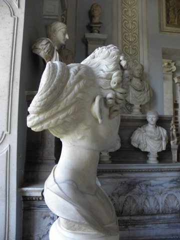 Roman women’s hairstyles of the late first century AD are notable for their voluminous frontal hair. Described by Juvenal as "tiers upon tiers" of curls (Sat. 6. 502-3), and by Martial as a "circle of hair" (Ep. 2.66.1) the development of this style is epitomized by the portrait of an anonymous woman known as the Fonseca bust (Figures 1, 2 and 3. Rome, Museo Capitolino, Stanza degli Imperatori, 15, Inv. 434, photos courtesy of Catherine Stephens). It is commonly held that such frontal arrangements required wigs or hairpieces supported on wire frames.