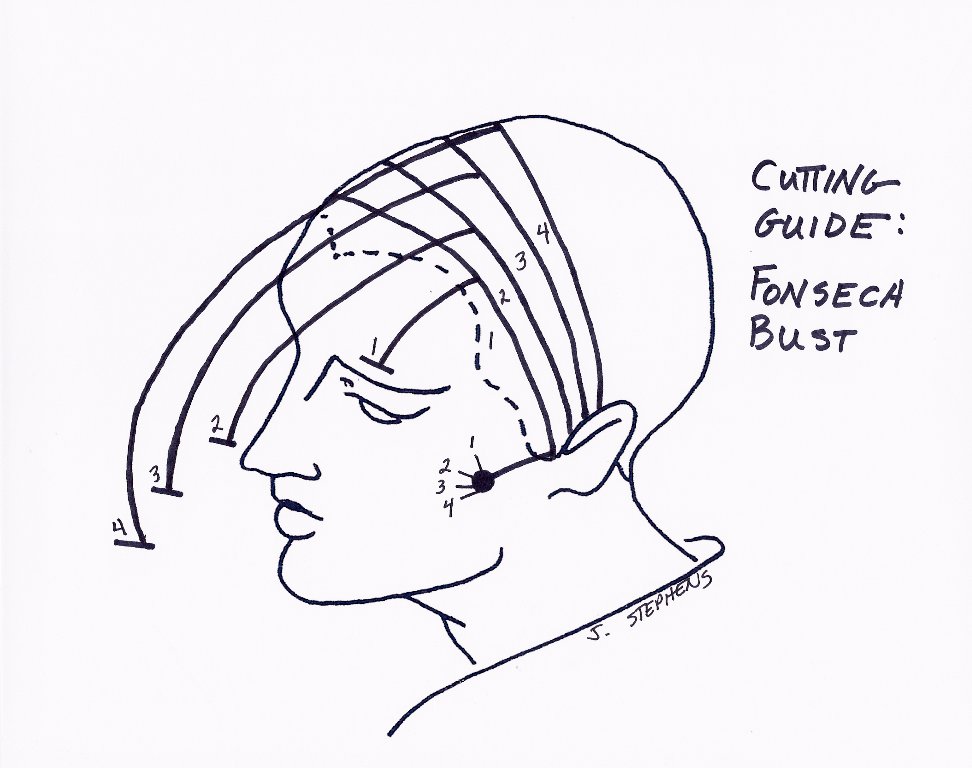 By comparison, the front hair is much shorter than the back hair (See Figure 1). At least three tiers of overlapping spiral curls form a rigorously horseshoe-shaped frame around the face. These curls show signs of artificiality because of their symmetrical directional movement. This is particularly evident in the row of curls touching the forehead: all the curls rotate toward the centre of the face, clockwise on the left and counter clockwise on the right. As one’s gaze travels from the forehead to the apex of the horseshoe, the length of hair in each tier increases: the lowest tier must be shorter than the top tier because, if all the front hair were as long as the top tier, the strands nearest the forehead would cover the face. For these tiers to be different lengths, sophisticated hair cutting is required. The Fonseca hairstyle may be recreated as follows.
