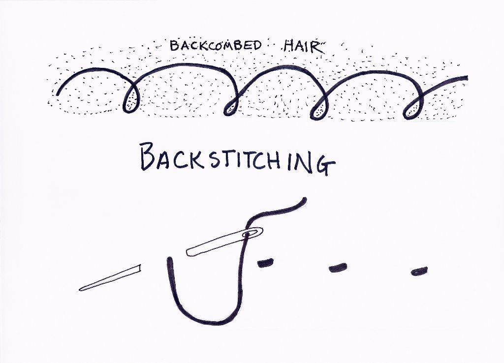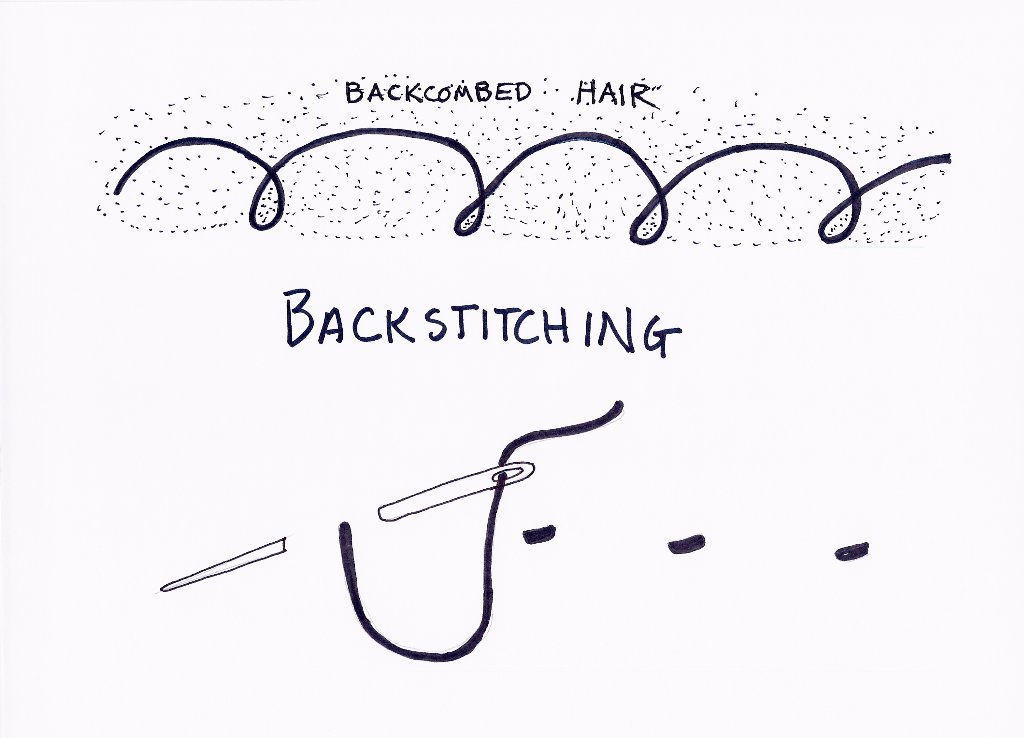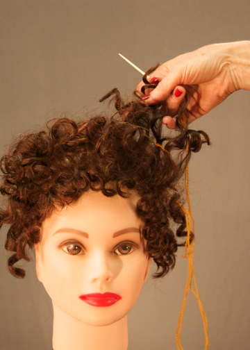 The horseshoe contour will be established by delicately back stitching the teased bases of Sections 2 and 3.Thread a blunt bone needle with at least an arm’s length of wool, matching the colour of the hair (See Figure 8). Stand in front or in back of the model according to preference. Begin at one side. Knot the end of the thread through the backcombed base of a curl nearest the ear. Stitch 'out' from the scalp, passing the needle through the regions of back combing nearest the spiral curls (See Figure 9). Enforce height by tugging on the ends of the curls where you are stitching. In the temple, stitch with slight tension so as to lift and over-direct the temple curls slightly closer to the head; this shapes the horseshoe contour. Over the top of the head, stitch loosely, so the curls remain evenly fanned out over their bases. Check the shape visually as you stitch. Stitch all the way to the other ear and back (two lines of stitching). Cut off the thread. Refine the ends of the curls with the calamistrum if needed.