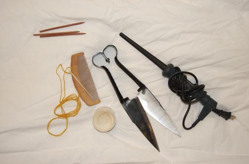 To recreate the Fonseca hairstyle, the following equipment was used: a manikin head with wavy human hair, leaf spring shears (forfex) (See Biagiotti 1990,163 no. 163), hair bodkins (discerniculum, discriminalia) (See Biagiotti1990, 105-7), wooden comb (pecten) (Biagiotti1990, 113), a calamistrum shaped curling iron (modern electric, to reduce fire hazard) (See also Biagiotti 1990, 87 no. 39), oil based pomade (unguentum) (See Lucas 1964, 87, 89, 327-337), a bone needle (acus) and wool thread (filum) (See Figure 4).