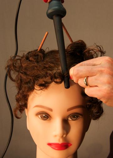 The tiers of curls will be shaped using heat. Before curling, apply a small amount of oil based pomade to the midshaft and ends of all of the cut hair. Oiling minimizes frizziness in subsequent steps and increases the curls’ holding power and resistance to humidity. Oiling, back combing and stitching provide the cohesion and support necessary for a long lasting result - of critical concern before the invention of hairspray.