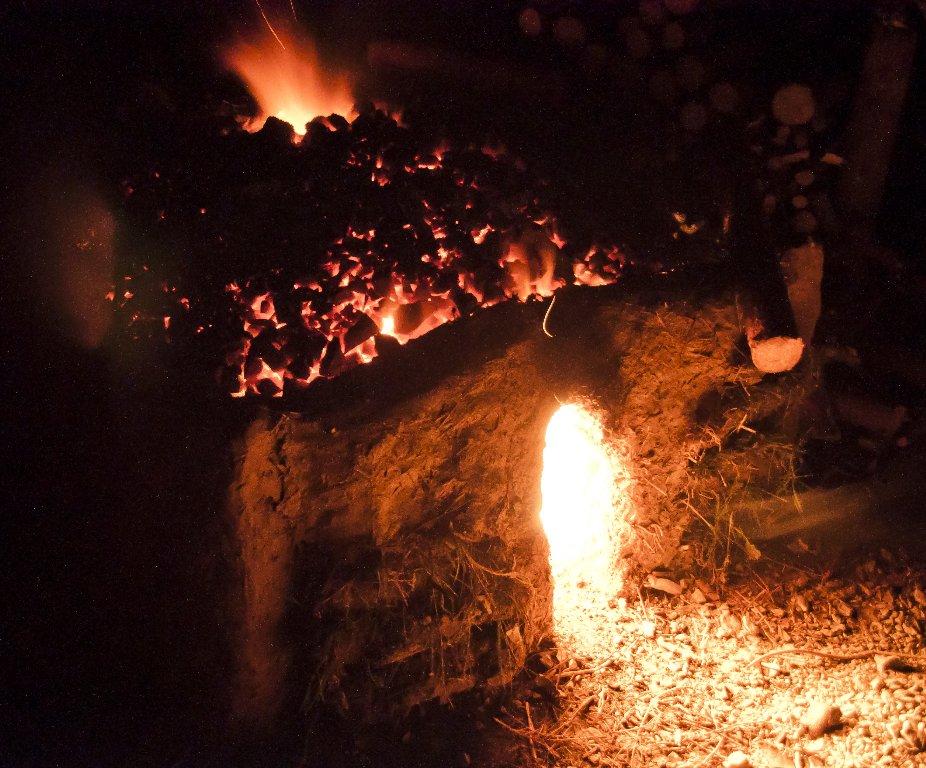 The fuel was added for 17.5 hours. The burning was very effective thanks to the fact that the hearth was sunken. The single pieces of wood were, after they were added, leaning against the layer of embers on the bottom and against the edge of the drawing eye on the other side. Most of the wood surface was therefore exposed to oxygen flowing into the kiln during burning. Thanks to that it was possible to use low quality fuel without causing a decrease of the operational temperature.