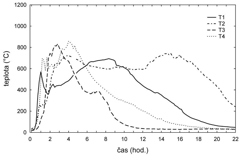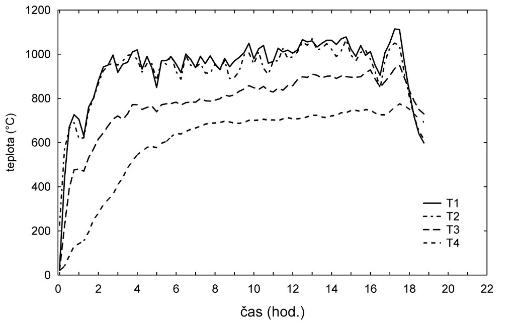 The time of burning at this temperature was relatively short. The temperature in the lower parts never exceeded 800°C. The thermal maximum there was reached after about 15 hours of burning and for nearly 8 hours the temperature stayed above 600°C.