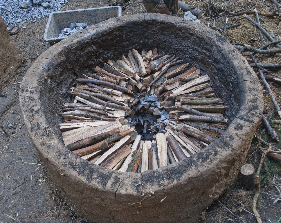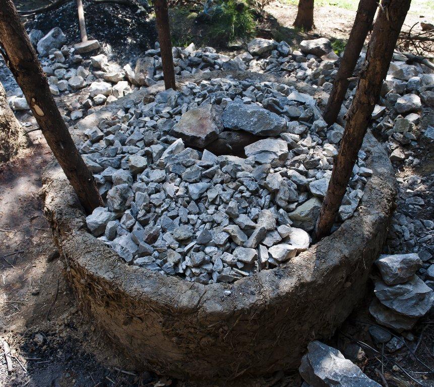 We used limestone from the Holštejn quarry in the Moravian Karst. It is grey to light grey bioclastic limestone with more than 96% of CaCO3. For the one-chamber burning it was crushed into fist-sized pieces. The fuel consisted of mixture of spruce and alder branches of about 8 cm diameter. When loading, the fuel was organised radially. The kiln was loaded alternately with layers of wood (See Figure 2) and limestone (See Figure 3) until it was completely full. The last layer functioned as insulation and consisted of large pieces of limestone (up to 40 cm in length). In the middle of the load a vertical shaft of about 30 cm diameter was left. The shaft was filled with spruce brushwood. About 600 kg of limestone and 150 kg of wood were used.
