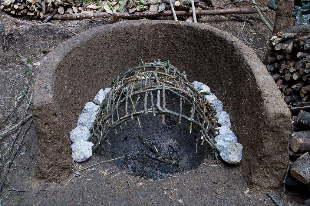 The design of the one-chamber kiln was based on the requirements of this type. The sunken part was created according to the archaeological find. The above ground cylindrical cover of 70 cm height connected directly to the sunken part. The cover widens conically on the inside. At the circumference of the cover at its base there were four drawing eyes to allow for regulation during the burning (See Figure 1).