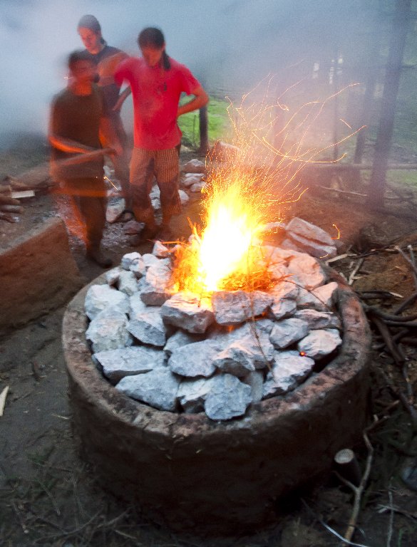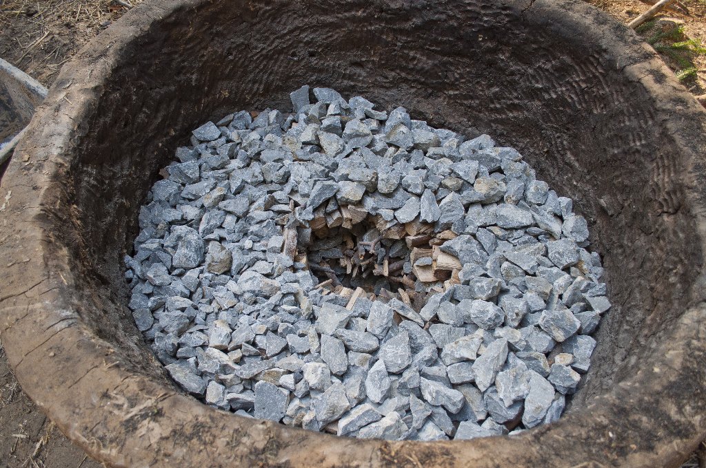 The primary aim of the next burning was therefore to adapt the loading of the kiln to allow for a better circulation of air throughout the whole load. The first layer of fuel was therefore stacked in a grate manner. Vertical rods were placed in the area of the drawing eyes (See Figure 6). These were pulled out after loading of the kiln, which left vertical channels leading from the lower fuel layer up to the surface of the load. All together we used 500 kg of limestone, 130 kg of gravel for insulation and 200 kg of wood. The temperatures in the centre of the load reached a maximum of about 950°C after 4 hours (See Figure 5B: T2 and T3).
