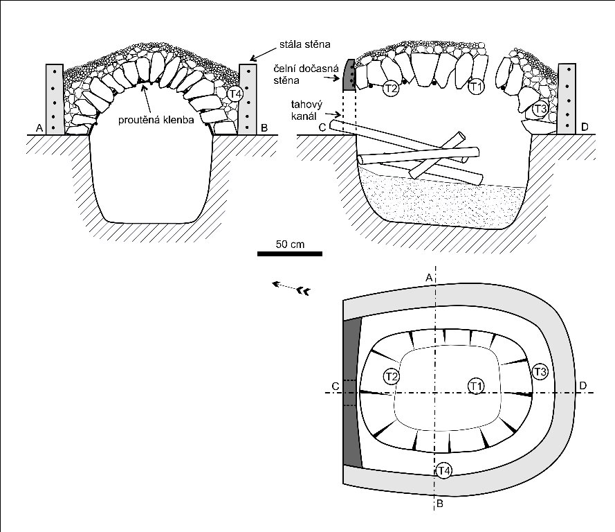 The remains of the reconstructed feature of the pyrotechnical structure from Tuněchodyis similar to other finds from the period (Uschmann 2006) and corresponded to the two-chamber burning method because of its depth, the even burning of the surrounding terrain and the presence of large amount of evenly burnt daub. There were several construction hypotheses of the kiln design. The hypothesis that carried the least contradictions with the data was used as a model. According to this hypothesis the permanent sides of the kiln consisted of a daub coating a horseshoe shape offset from the sunken part in such a way that it created a bench to build the lime arch on. The front side stayed free, which made loading the kiln easy. Only after loading was this side closed with thick rod armature coated with daub. After the burning this side was dismantled.