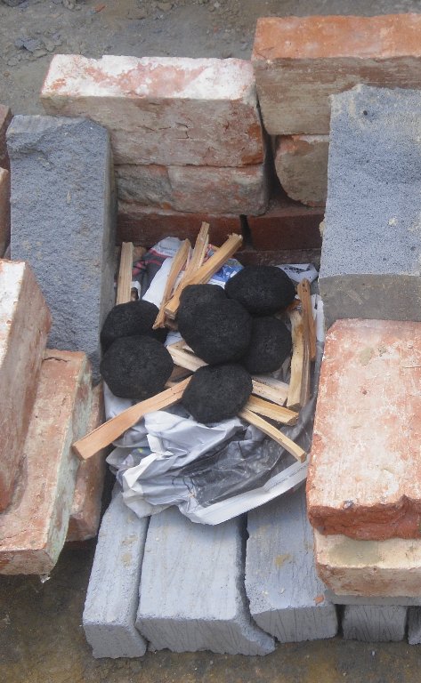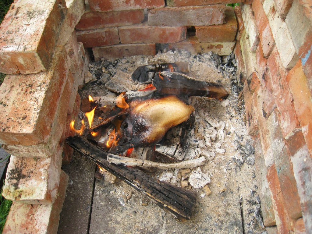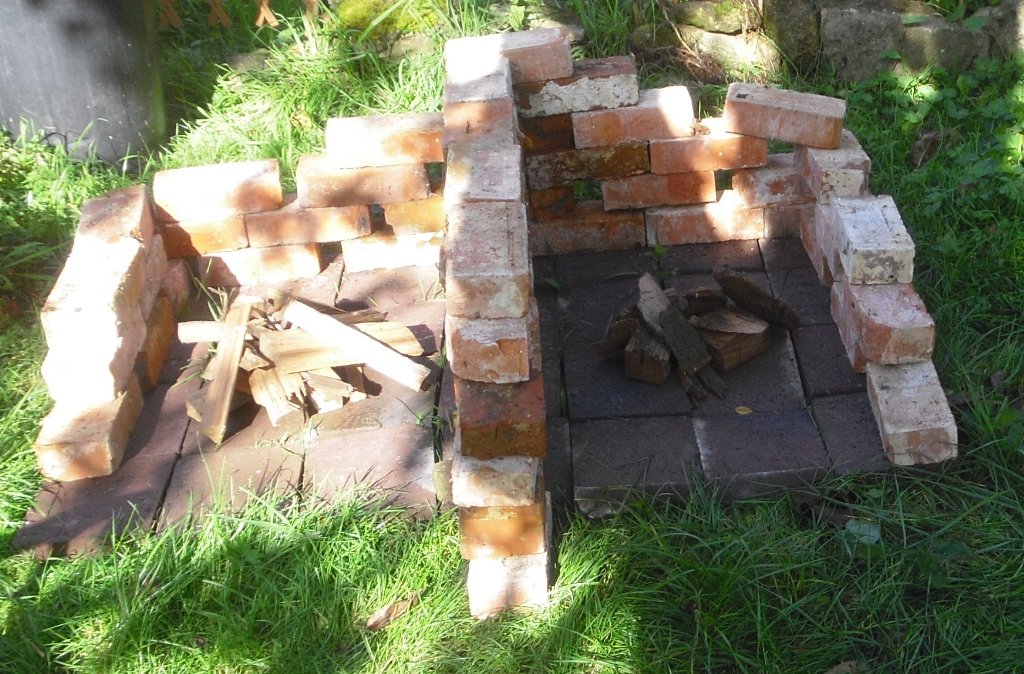 Several pyres were prepared, each surrounded by a small brick wall on three sides to protect it from wind and to minimise CO2 cross-contamination (See Figures 1 & 2). Animal remains obtained from local butchers, fish mongers and supermarkets were burned on different pyres fuelled with manufactured coal briquettes or dendrochronologically dated wood. The animal samples included a cow tibia, two pig ribs, a foot and a shoulder, two lamb legs, a whole chicken, and two fish vertebral columns. The pig foot and shoulder still retained all flesh and skin and were specially chosen, together with the whole chicken, to represent as closely as possible the remains of a recently deceased individual.