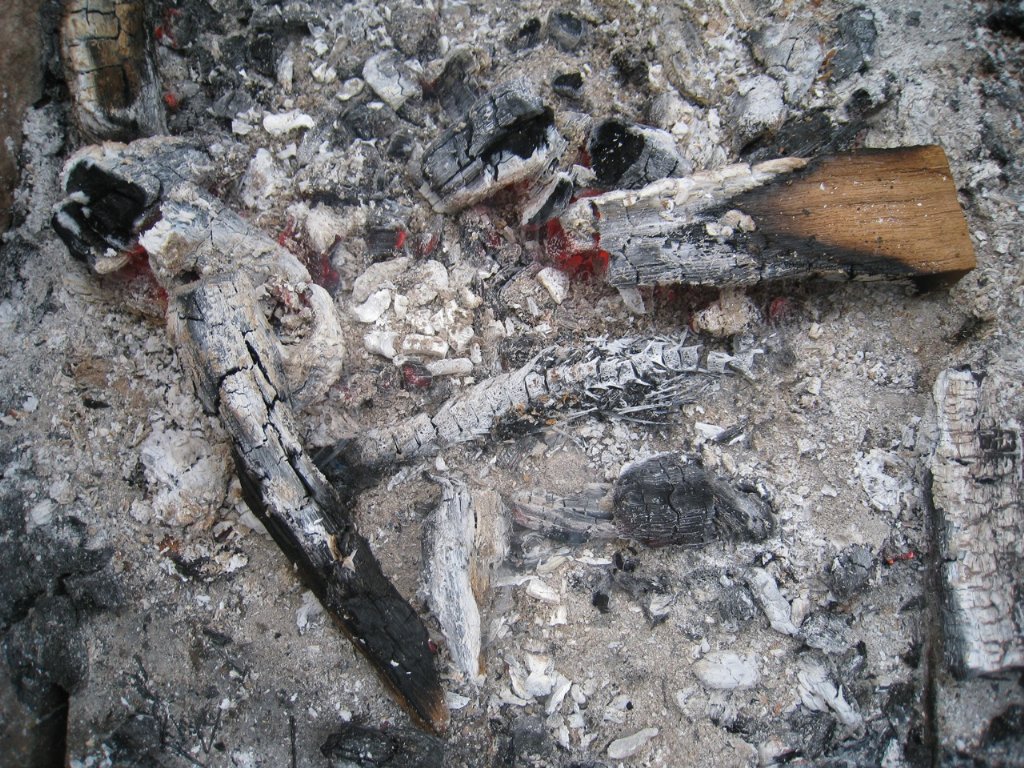 Starting the fire was relatively easy, and in about 10 minutes, the pyres were burning well, reaching temperatures above 600ºC. Once the pyres were lit, the animal bone pieces were placed on the difference fires and left there until full calcination, until it started to rain (a hazard of outdoor experiments in Britain!) or until the fire went out. The fires were maintained until no more wood was available. During burning, the flesh and skin became black before disappearing completely. The colours of the remaining bone fragments gradually turned from black to white. Black colour indicates that the bone is not fully cremated while white is characteristic of fully calcined bone (Shipman et al. 1984).