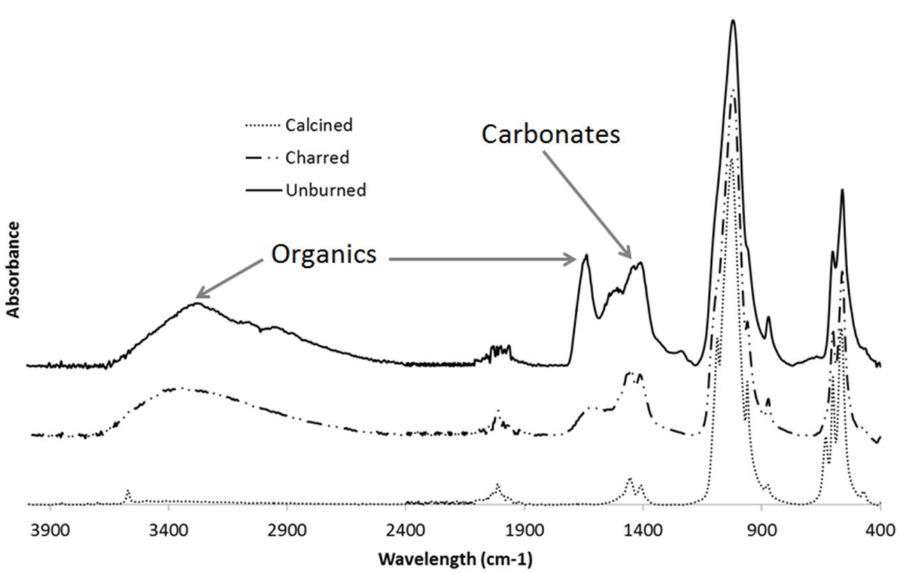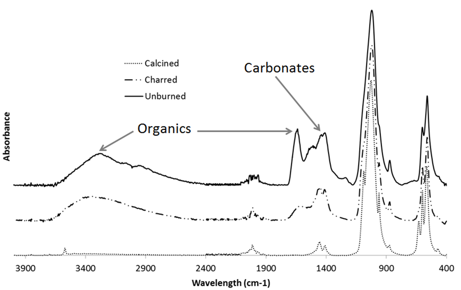 Cremated (charred and calcined) and unburned bone fragments were analysed by Fourier Transform Infrared Spectroscopy (FTIR) in order to observe structural and compositional changes. Figure 6 presents the infrared spectra of an unburned, charred, and calcined cow tibia. The first main feature of interest is the complete removal of organics once the bone is calcined. Yet it is still possible to detect a large amount of organic material in the bone when it is only partially burned, in other words, charred. The second observation is the loss of a large amount of carbonates during the transformation of unburned into fully calcined bone fragments. Fortunately, some carbonate remains, and this is of particular importance for radiocarbon dating. Since all organic material has been destroyed during cremation, the small amount of carbonate left in the bone after cremation is the only place in which carbon can be found. It remains unclear, however, whether this carbon is endogenous to the bone or whether it has been absorbed from elsewhere (for example from the carbon dioxide emitted by the flesh and skin, or by the fuel used during cremation).